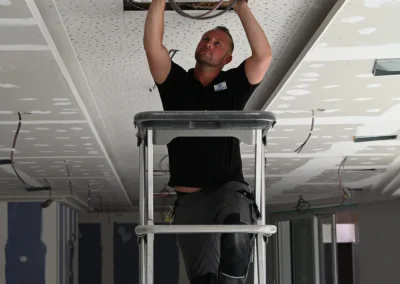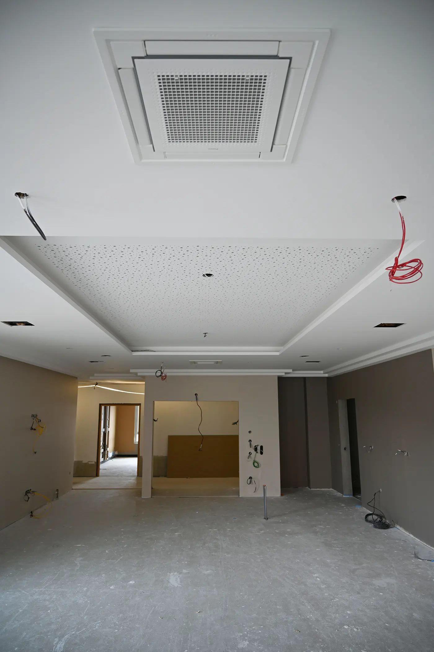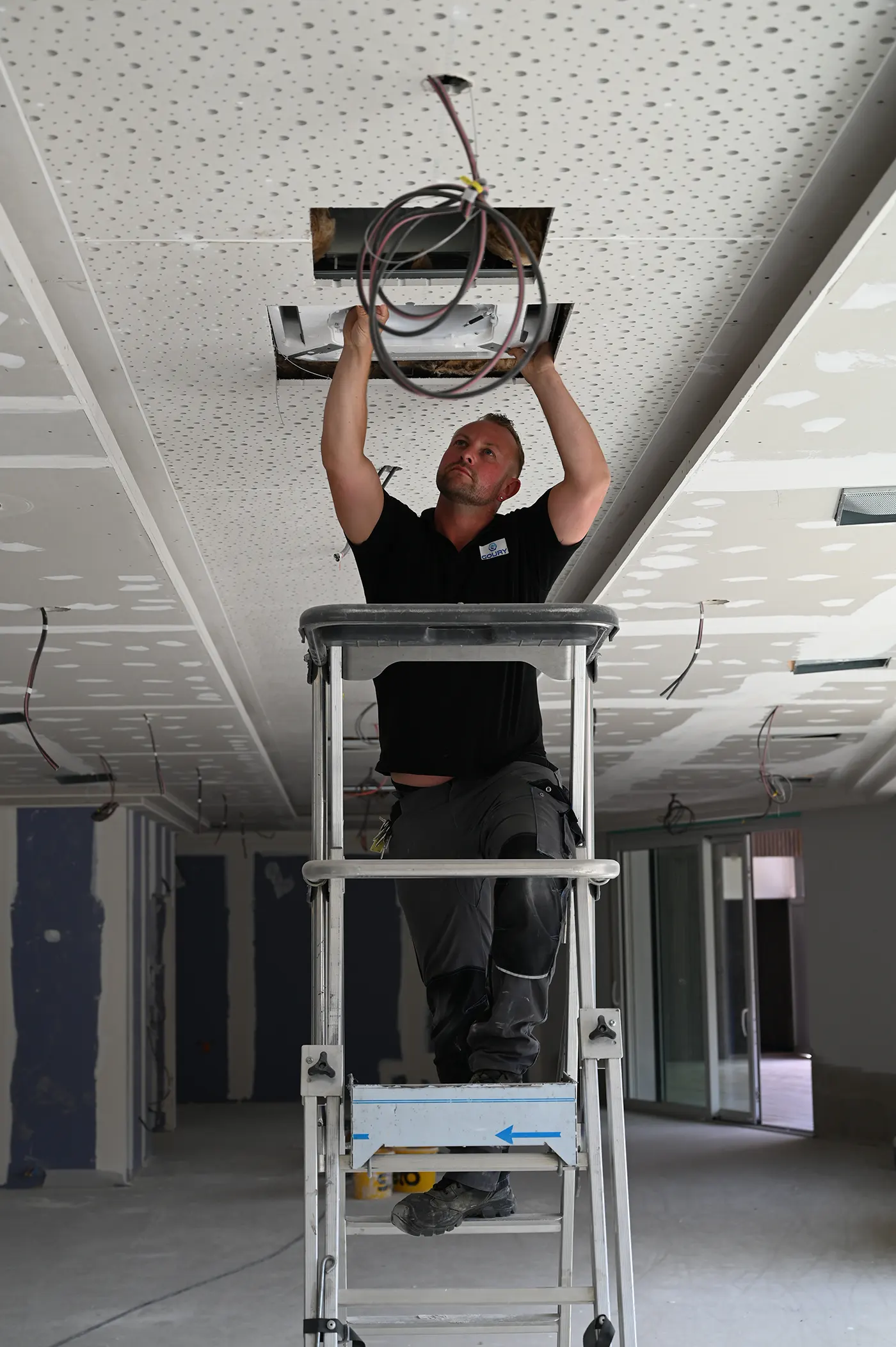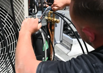 - Fixation des unités intérieures (murales, consoles, plafonniers ou gainables) avec vérification du niveau et des systèmes d’évacuation des condensats.