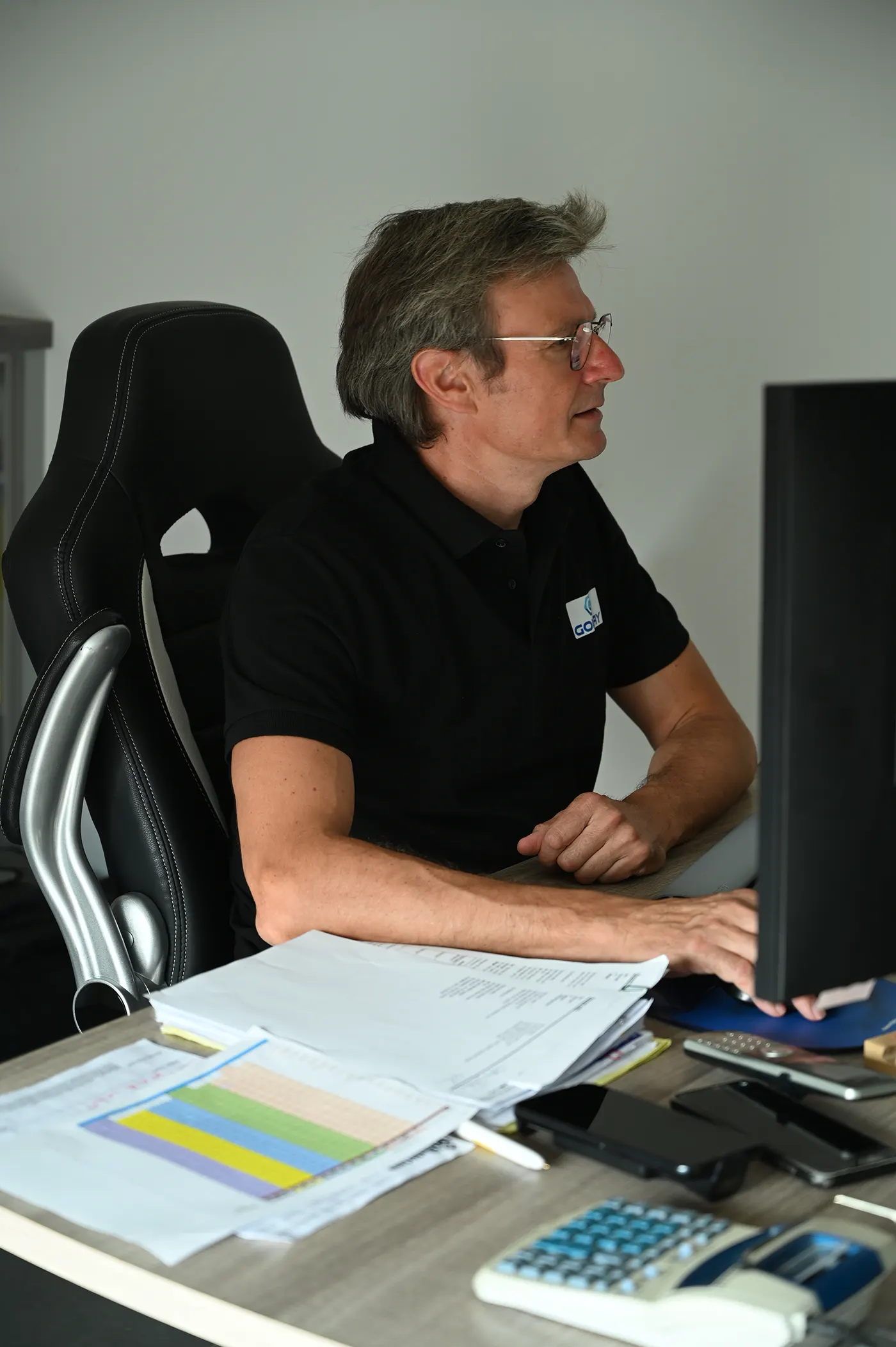 La société Goury dispose d’un bureau d’étude intégré. Il est composé d’un “chargé d’affaire” qui étudie le projet, analyse le besoin et s’occupe essentiellement de la partie tertiaire. Il est associé à un “acheteur” responsable du parc matériel et des produits, d’un “technicien d’étude”, spécialisé dans les analyses de prix et d’un “dessinateur” informatique.